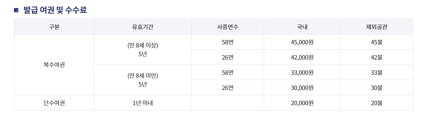 ▶ 복수여권 5년짜리의 경우 58면의 경우 33,000원(만 8세 미만), 45,000원(만 8세 이상~ 만 18세 미만) // 26면의 경우 30,000원(만 8세 미만), 42,000원(만 8세 이상~ 만 18세 미만)입니다.