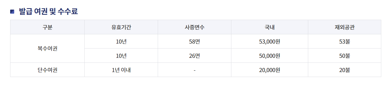 ▶ 복수여권 10년짜리의 58면의 경우 53,000원 // 26면의 경우 50,000원입니다.