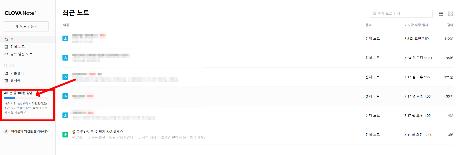 최근에 추가로 받은 100분을 포함하여 총 400분을 받은 상태입니다. 400분이면 대략 7시간 정도의 시간이기 때문에 매일 많은 양의 녹음 파일을 넣는 게 아니시라면 충분히 쓰고도 남을 양이지 않을까 싶습니다.